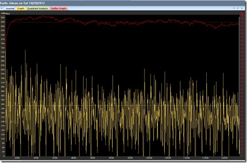 Despite all the craziness, I had a great race, ending in 5th place. I was able to start off within myself and finish strong, picking off one-by-one the riders ahead who had started too fast. I didn't have my Quarq on for this race, but I did record my speed and HR data. The graph shows a nice, steady cardiac drift. This is an example of good pacing. The red line is HR, with the dashed horizontal at my LT HR – 178bpm. Check it out: